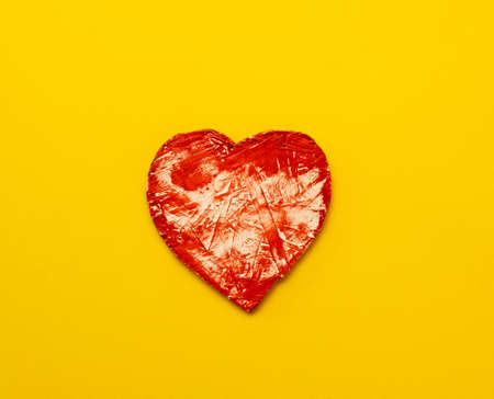 white heart after smear red stripe of paint. Valentine's day love. White background. copy space close up