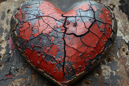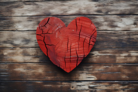 Cracked red heart symbol on dark wooden background for emotional and relationship concepts