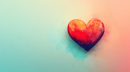 A textured red heart sits on a soft pastel background with a subtle color splash.