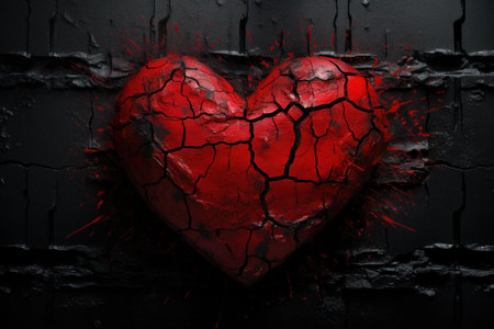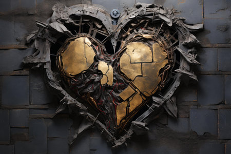 Crimson heart joined by golden dots inside a cracked wall generative ai