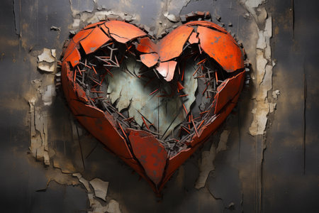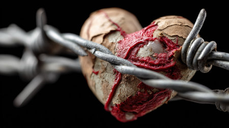 This evocative image captures a broken heart entangled in barbed wire, representing emotional pain and struggle against adversity, conveying deep feelings.