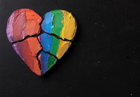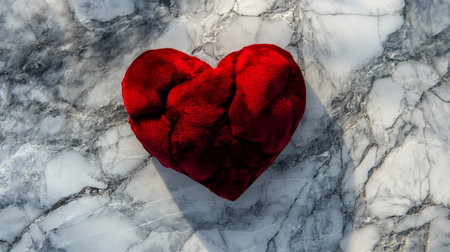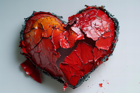 A striking representation of a broken heart crafted from fragmented red ceramic pieces, showcasing the beauty and pain of emotional struggles in relationships.