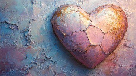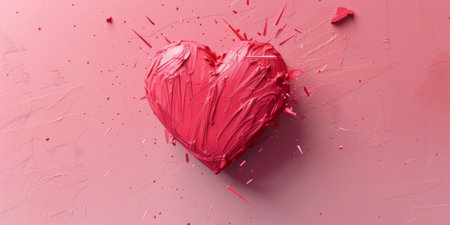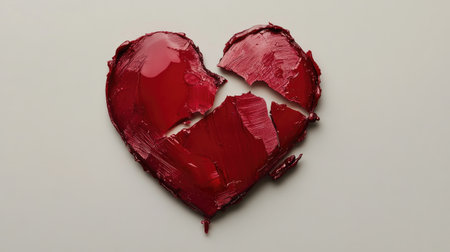 This artwork features a broken heart crafted from red paint on a neutral background, symbolizing the complexities of love and heartbreak through its textured surface and vibrant color.