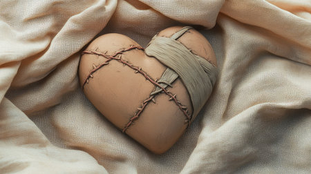 This artistic ceramic heart features stitched details and is wrapped in natural fibers, resting on soft fabric, symbolizing love, care, and creativity in a serene setting.