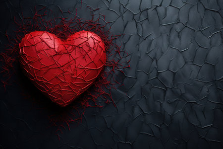 A striking red heart with visible stitches and cracks symbolizes emotional pain and healing. This captivating artwork illustrates vulnerability and artistic expression.