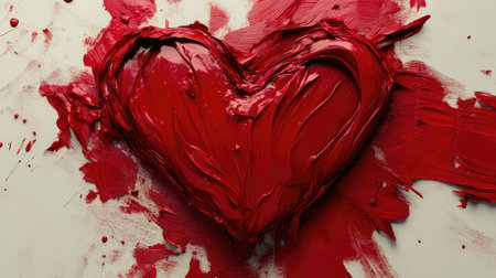 A red heart is painted on a white background. The heart is surrounded by red paint, and the background is also painted in red. The painting has a romantic and passionate mood