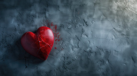 Broken red heart on a dark retro background. Minimal abstract lost love and breakup concept. Loved ones we lost idea and strong emotions idea. With copy space.