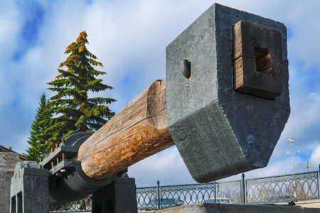 cannon with wooden wheels on the background of the fortress, a defensive weapon