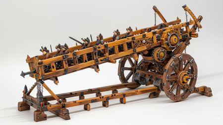 Massive wooden medieval siege engines or weapons on a sunny day