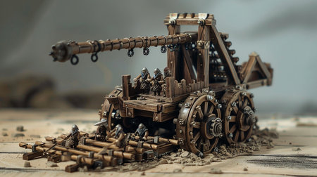 small wooden catapult model, miniature reproduction of medieval siege weapon