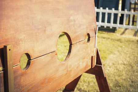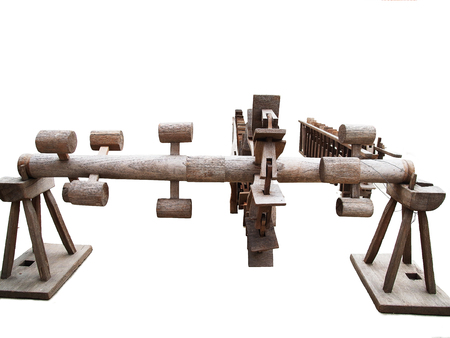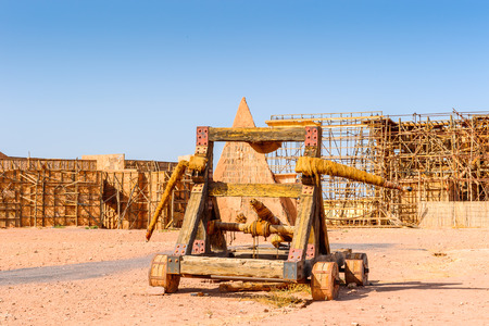 old wooden catapult, ancient combat weapon