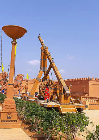 Polkampally, Telangana / India - JAN-18- 2020: Inside Ramoji film city, Visitors are enjoying Bahubali movie making set.