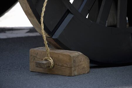 Old wooden pillory close up on castle stone wall background