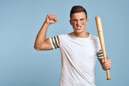 baseball guy with a bat in his hand on a blue background and a combat color on his face makeup model t-shirt