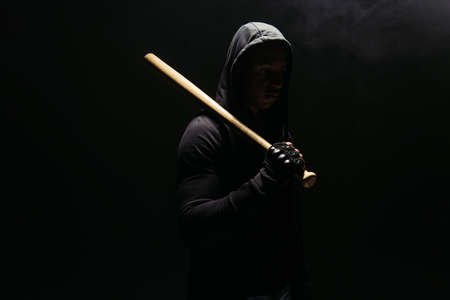Silhouette of bandit in hoodie holding baseball bat on black background with lighting and smoke