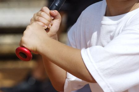a baseball bat in the hands of a young white man in a black vest. strong hands grip the bat