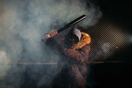 Masked angry man with bat in smoke.