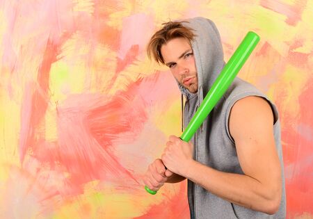 brutal man with baseball bat express aggression or play game, hit