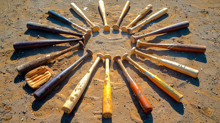 Baseball bats arranged in circular pattern on pitcher's mound in sunny ballpark. Concept of sports equipment, team sports, baseball practice. Vertical.
