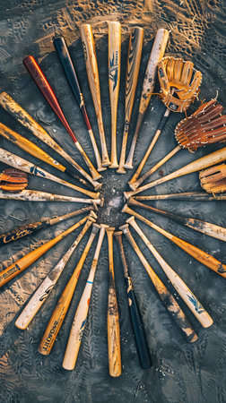 Arrangement of assorted baseball bats and gloves laid out in a circular pattern on a grassy field. Concept of sports equipment, baseball training, team spirit, and outdoor recreation.