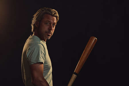 Portrait of handsome man with baseball bat for fighting. Dangerous man with serious emotion.