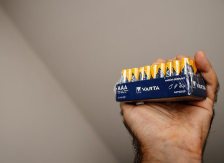 Paris, France - Jan 23, 2021: POV male hand holding new package of batteries LR03 AAA manufactured for UK Supermarkets in France - piles alcalines