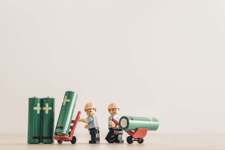 Workers using hand truck for carrying batteries. Illustrative editorial. October 04, 2021