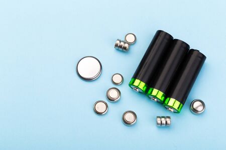 High voltage Volt 9V battery and alkaline AA battery on a blue background. Energy.
