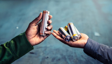 Two people work together to recycle batteries, promoting sustainability and eco awareness.