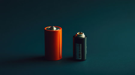 Close-up view of two different batteries on a dark background. The image highlights the contrast between a larger orange battery and a smaller black one, showcasing their distinct designs and utility in various devices.