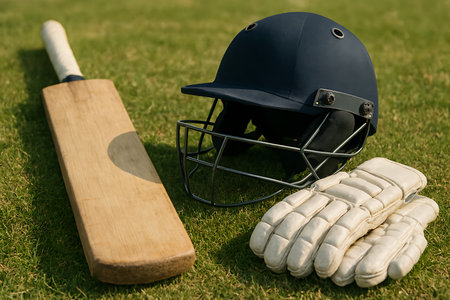 Close-up of a cricket bat, gloves, and helmet arranged on green grass in natural sunlight.