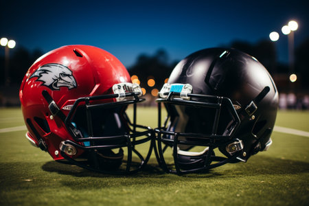 a scene with a football field, two american football helmets, and blurry stadium lights in the background