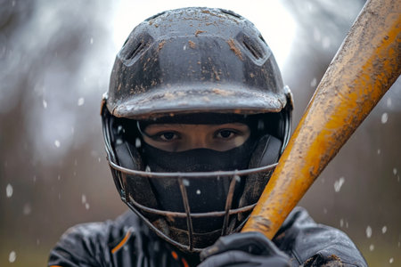 Determined Baseball Player Focused Under Rainy Night Lights, Ready To Swing, Close Up, Copy Space