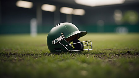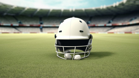 A Cricket Helmet Resting on Lush Stadium Grass
