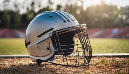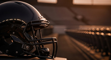 Football helmet placed on a bench in an empty stadium, bathed in warm sunlight, highlighting the equipment and evoking a sense of anticipation and competition