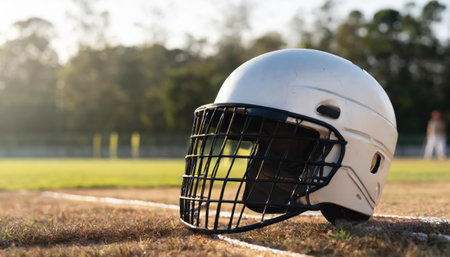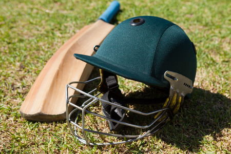 Cricket helmet on the field with blurred background. soft focus