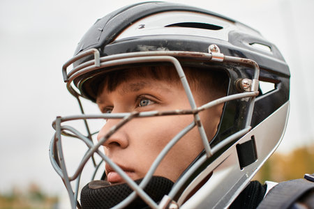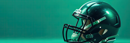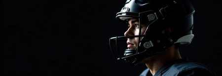 Profile of american football player wearing helmet, concentrating before the match, with copy space on the left