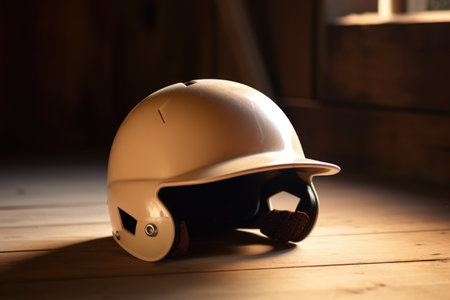 Close up of baseball helmet on wooden surface, created using generative ai technology. Baseball, sports and competition concept digitally generated image.