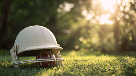 Cricket helmet and ball resting on green grass in the golden light of a late afternoon