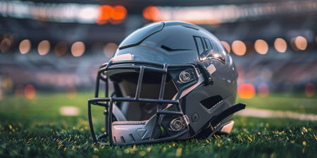 American football helmet on the field in the evening,selective focus