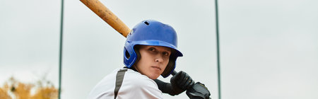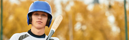 A focused player readies himself to swing a bat on a bright day while playing baseball, banner