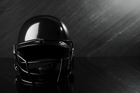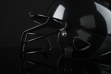 Black baseball helmet on dark gray background, space for text