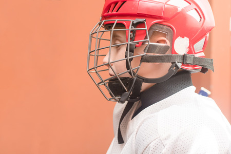 young hockey player in uniform in training