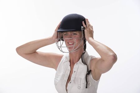 Portrait of a woman cricketer adjusting her safety helmet