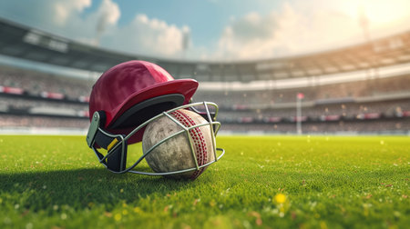 A wooden cricket bat, red leather ball and protective helmet rest on the green grass of a professional sports stadium pitch during a warm golden sunset evening before a match.