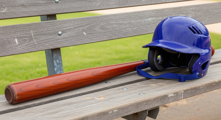 Baseball bat and blue helmet on wooden bench in park setting