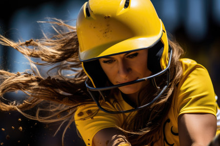 A focused young woman in a baseball helmet and blue jersey grips her bat, exuding confidence and determination. The warm sunlight highlights her striking features, capturing the spirit of youth and the thrill of the game.