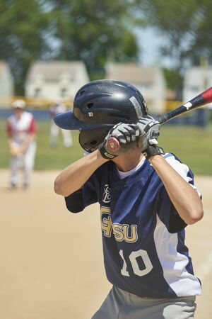 Kid baseball ready to bat. Child batter about to hit a pitch during a baseball game.