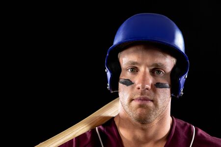 Portrait close up of a Caucasian male baseball player, a hitter, wearing a helmet and sun block, holding a baseball bat on his shoulder and looking to camera