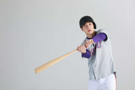 Handsome asian man with baseball bat. Prepare to hit the ball gesture. Baseball player holding baseball bat.